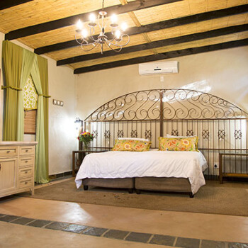 The accommodation comprises 7 bedrooms in the main house and 4 separate self-catering units. The luxury suites contain a queen-size bed and en-suite bathroom with a shower. The luxury room contains a king-size bed, TV, and en-suite bathroom with a shower. The exclusive suites contain a king-size bed and en-suite bathroom with a bath and shower. The self-catering units comprise 3 bedrooms, 1 bathroom, an open-plan living area and kitchen. The main bedroom contains a double bed. The second and third bedroom each have twin beds. The shared bathroom contains a bath and shower.